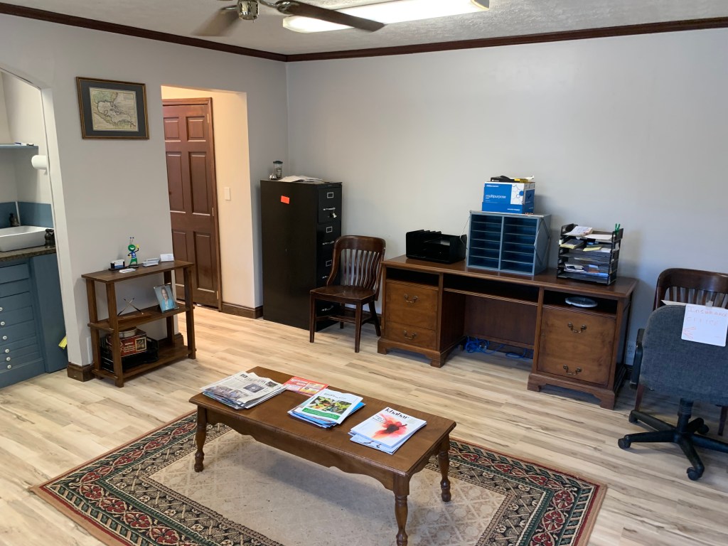 Office spaces for rent include use of the common space and parking lot. The building has a conference room, pictured above, as well as a front lobby with a small kitchenette that includes a fridge, sink, and microwave.